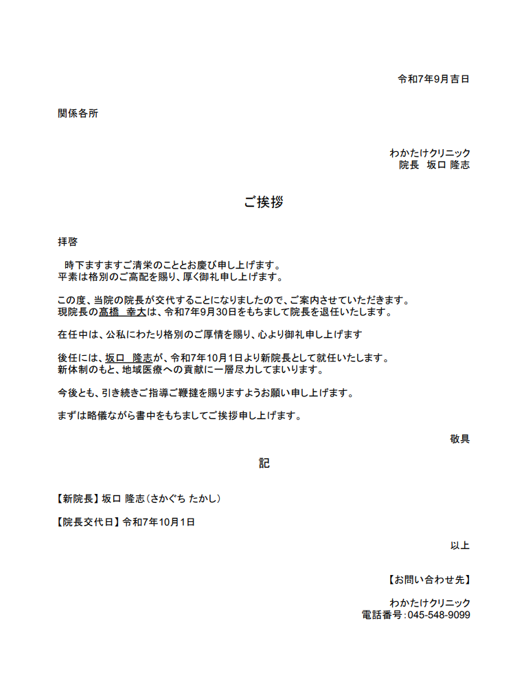 | 2025年10月〜 | クリニック新院長就任案内あり |
